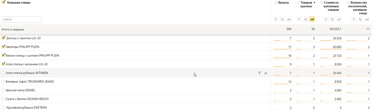 Чем больше раз пользователи посмотрели страницу товара, тем популярнее он будет. В отчете вы можете выбрать ТОП товаров и смотреть данные по ним.