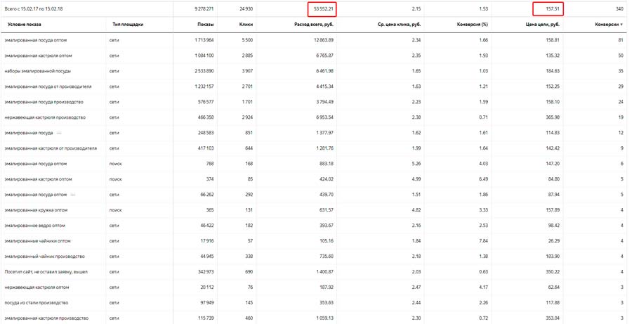Тут уже стоит обратить внимание, что сумма затраченных денег на конверсионные запросы меньше, чем на всю рекламную кампанию. Всё это логично, пойдём дальше. Посмотрим разрез по рекламным площадкам:
