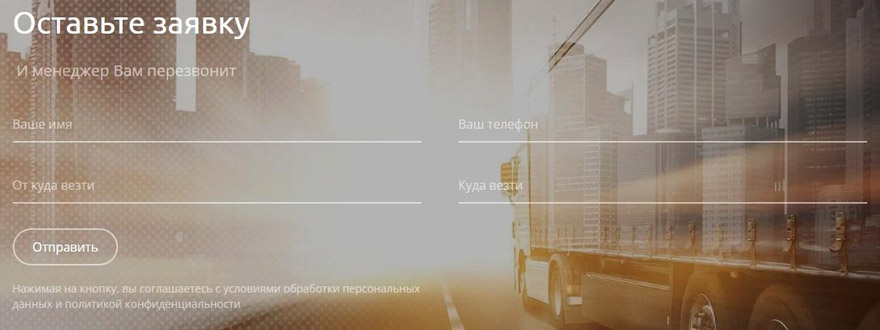 Вы торопитесь всё успеть в этот вечер и вряд ли будете ждать, пока перезвонят специалисты. Скорее всего перейдете на другой сайт, а компания потеряет вас как клиента. Заметьте, что кто-то старался, делал современный дизайн этой формы, выбрал стильную подложку, на которой грузовик мчит по дороге, но всё это, к сожалению, тщетно. В лучшем случае вы не уйдёте с этого сайта, а начнёте звонить в транспортную компанию самостоятельно. Если и дозвонитесь, то не факт, что в вечернее время быстро подадут газель по нужному адресу.