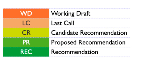 Разноцветные обозначения — это стадии жизненного цикла спецификации, начиная от черновика, про который мы упоминали, и заканчивая рекомендацией для вендоров. Вендоры в нашем случае это компании-разработчики браузеров.