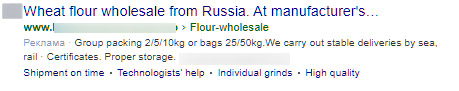 В список минус-слов попали все виды муки, которые наш клиент не продаёт (амарантовая, гороховая, гречневая, кокосовая, кукурузная, льняная, миндальная, нутовая, овсяная, подсолнечная, пшеничная, рисовая, ячменная, сверчковая, чечевичная и т.д.). Без этой работы только по ключевому слову «мука», клиент получал бы слишком много нецелевого трафика.