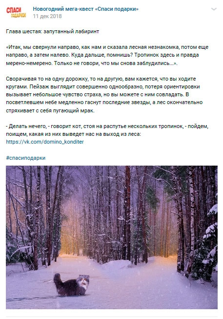 Идея была в том, чтобы интересно поздравить участников с Новым годом в группах спонсоров, когда многие компании проводили конкурсы за репост. Участники попадали в интересную детективную историю, каждым заданием была новая серия, которую читали взахлеб.