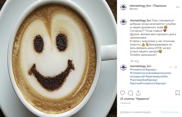 Особое внимание мы уделяли текстам постов, которые согласовывались с врачами стоматологии. Это было сделано для того, чтобы вовлечь аудиторию во взаимодействие с контентом и перевести подписчиков в ранг читателей. Сократили количество хештегов до 5 штук на пост и стали подбирать их к каждому посту индивидуально. Указывали геолокацию в каждом посте.